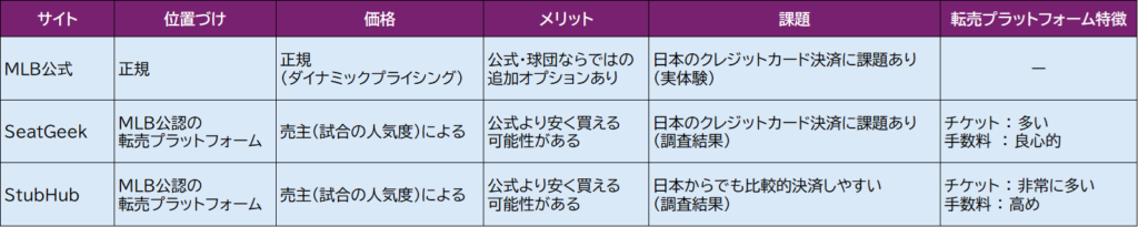 MLB公式とかSeatGeek、StubHub とかも聞くけど、違いは何?