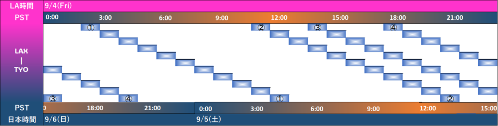 ではTYO-LAX便が運航している4つの時間帯を見てみましょう|おすすめの直行便はどれか?
