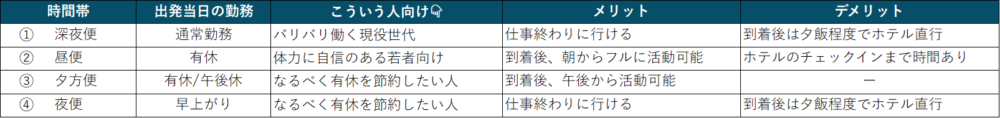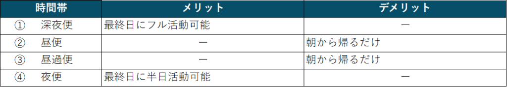 それぞれの便を比較してみましょう。(成田・羽田問わず空港アクセス1時間程度で想定)想定されるメリット・デメリットを含めまとめてみました。