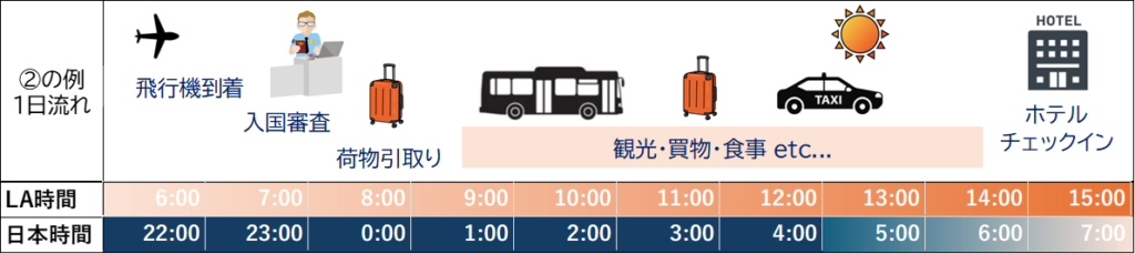 人それぞれ、重要視するポイントは違うので一概にどれがいいとは言い切れません。なるべく仕事を休まずに行きたいのか、現地での活動時間を最優先したいのか。一見すると②が到着日からフルに活動できそうではありますが、観光・旅行で行く場合、長時間フライトと入国審査で疲れ時差ボケの中、普段は寝ている時間に朝からスーツケースを転がしながらフルで活動できる人も少ないと思いますので、あまりお勧めはできません。到着日は時差ぼけ調整と休養に充てる事をおすすめします。
