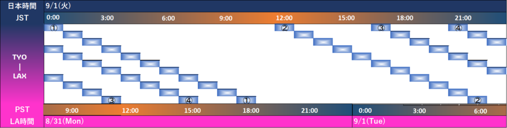 日本・海外の航空会社(コードシェア含む)いろいろ乗り入れていますが、TYO–LAXの時間帯は大きく4つに分かれます。フライトの時間は「需要」×「到着空港の受入れ枠(スロットの有無)」により決まります。ロサンゼルスのように大きな空港は世界中の航空会社が乗り入れるため、空港のオペレーション的にも一定の時間帯に便が集中するかたちになっています。