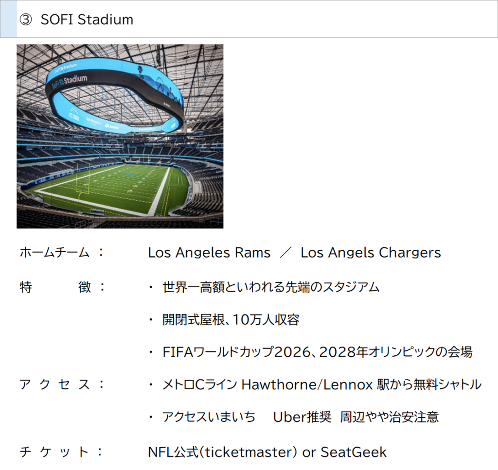 - NFL → スケールとエンタメ性がすごそう、でもアクセス・チケットのハードル高そう